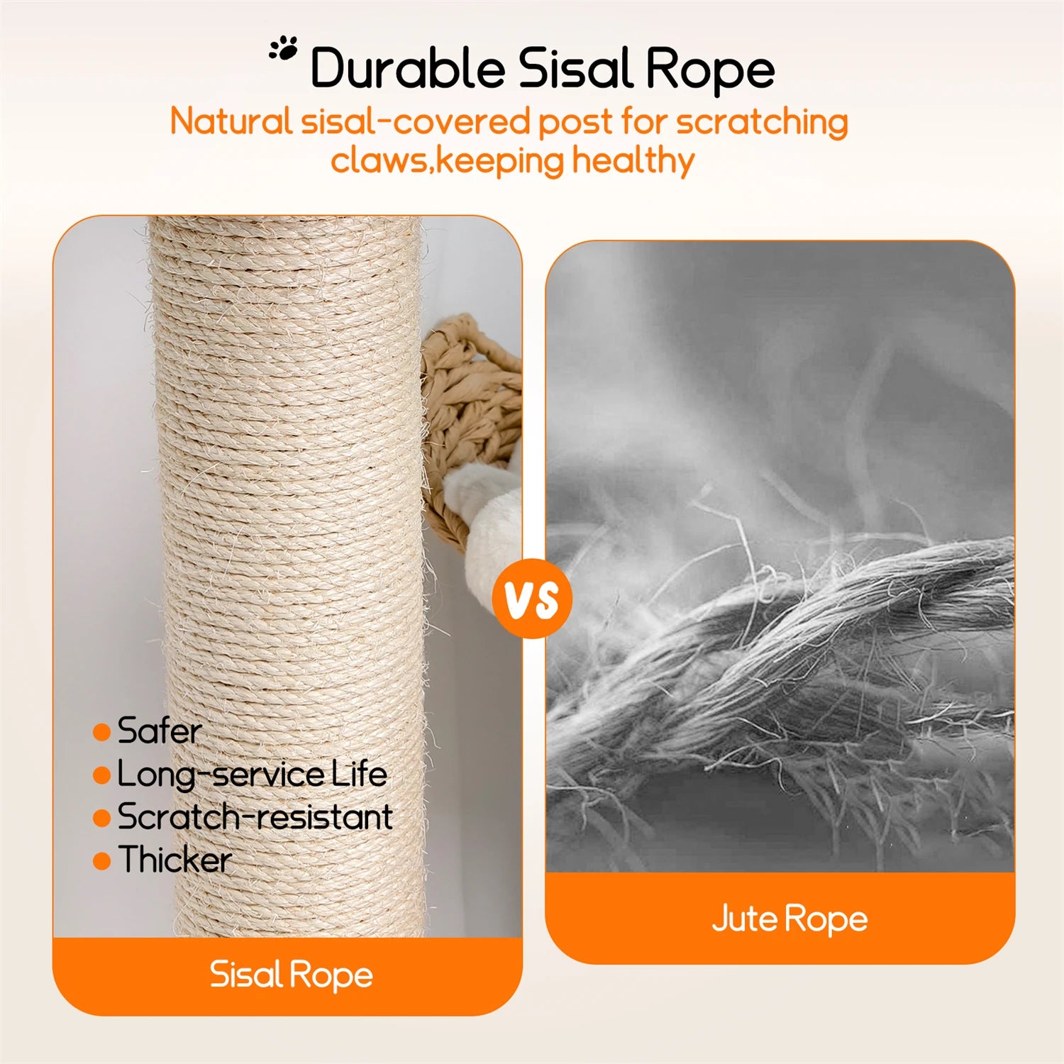 - Premium materials include plush liner, sisal rope, particle board, rubber wood, and paper string for lasting scratching surfaces and cozy rests.