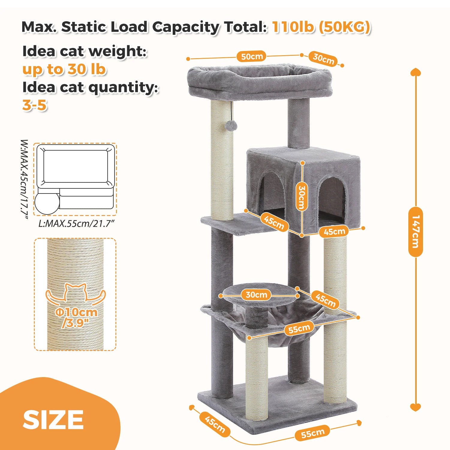 - Ideal for multi-cat households (3–5 cats) and tall enough at 147 cm, it comes with labeled parts, detailed instructions, and the tools you need for quick assembly.